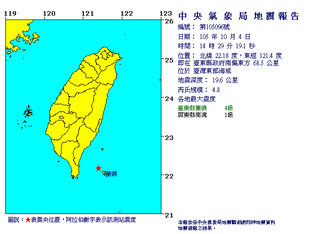 發震時間:105年10月4日14時29分19秒