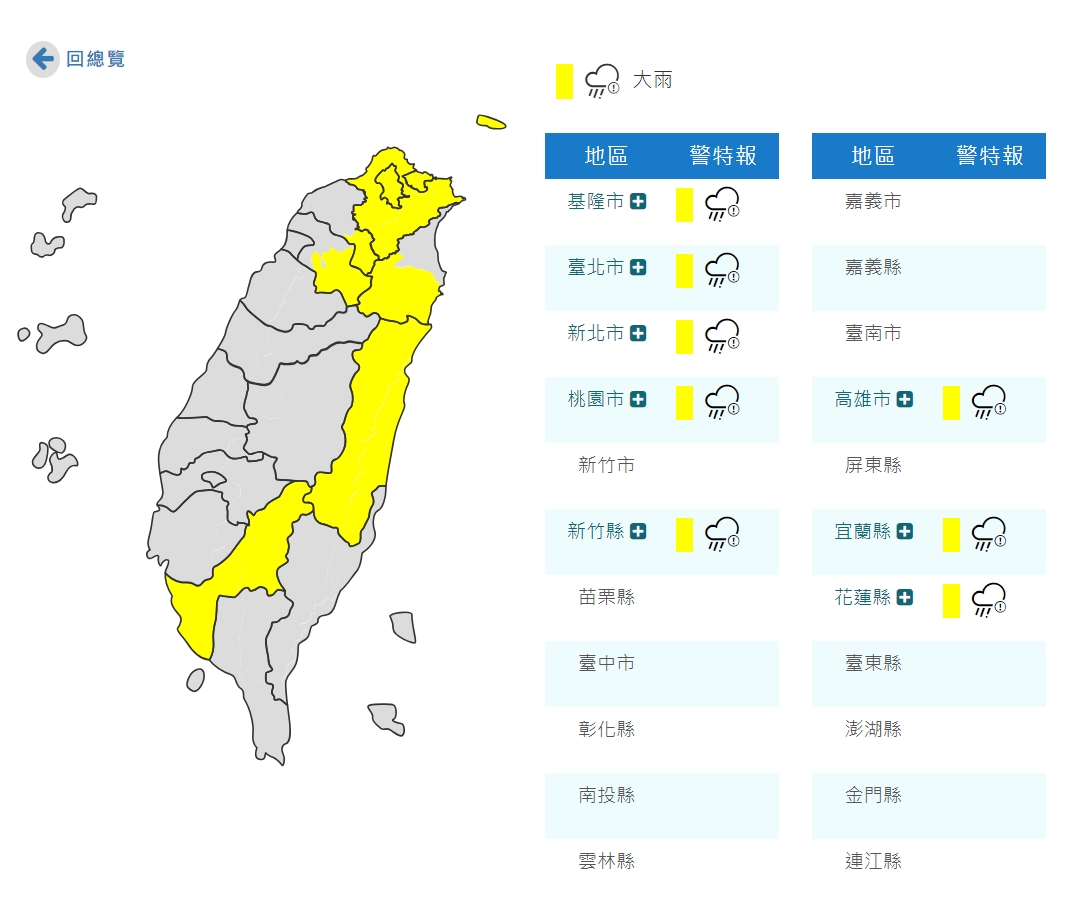 ▲▼中央氣象局對基隆、臺北、新北、高雄、花蓮地區及桃園、新竹、宜蘭發布大雨特報,再對雙北發布大雷雨特報。(圖/翻攝自中央氣象局)