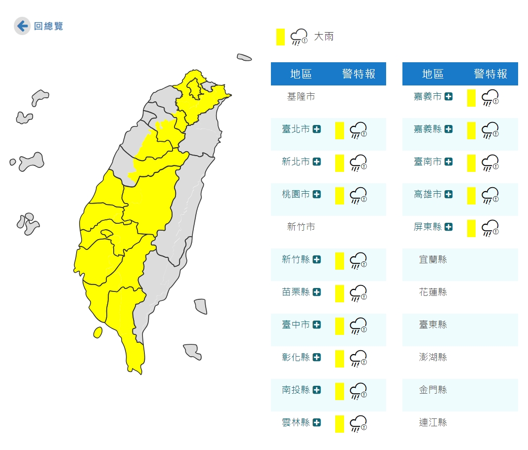 中央氣象局對台北市、新北市、桃園市、新竹縣、苗栗縣、臺中市、彰化縣、南投縣、雲林縣、嘉義市、嘉義縣、臺南市、高雄市、屏東縣,共14縣市發布大雨特報,氣象局提醒,請注意雷擊及強陣風,出門時務必攜帶雨具。