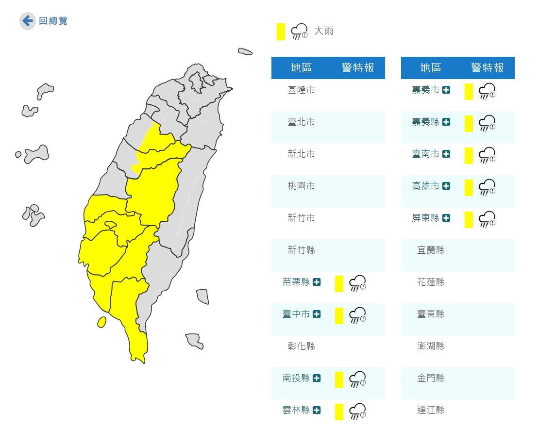 氣象局對苗栗縣、臺中市、南投縣、雲林縣、嘉義市、嘉義縣、臺南市、高雄市、屏東縣等9縣市,發布大雨特報,南投、雲林以南地區及苗栗、臺中山區有局部大雨發生的機率,提醒民眾出門時,務必攜帶雨具。