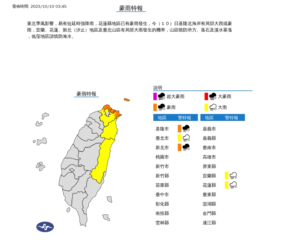 氣象署今日凌晨3時45分發布豪雨特報,提醒民眾,東北季風影響,易有短延時強降雨,花蓮縣地區已有豪雨發生,今日基隆北海岸有局部大雨或豪雨,宜蘭、花蓮、新北(汐止)地區及台北山區有局部大雨發生的機率,山區慎防坍方、落石及溪水暴漲,低窪地區請慎防淹水。