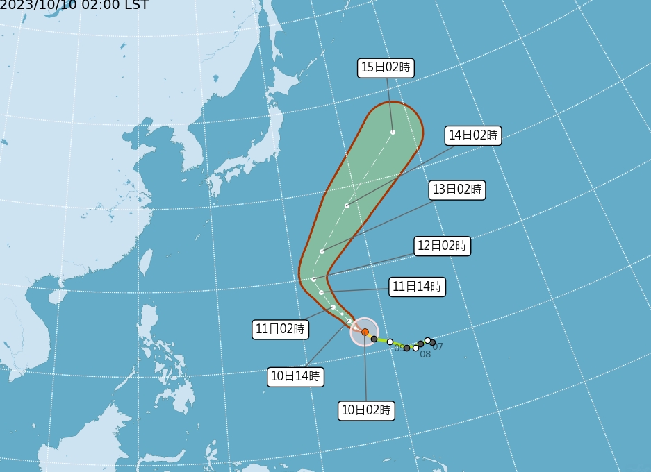 中央氣象署最新(10日2時)路徑潛勢預測圖顯示,「中颱布拉萬」將持續增強,挑戰「強烈颱風」門檻;目前在關島東南方海面,向西北轉北北西再轉北北東,3天後(13日2時)在日本南方遠海、朝東北方向,加速遠離日本。