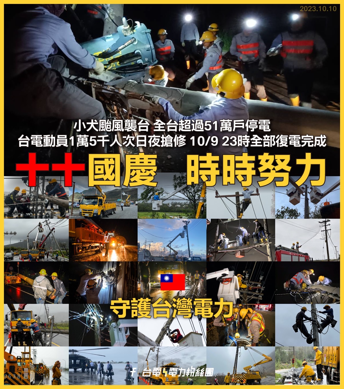 ▼小犬颱風襲台,造成超過51萬戶停電 ,在台電搶修下已復電完成。(圖/翻攝自台電電力粉絲團)