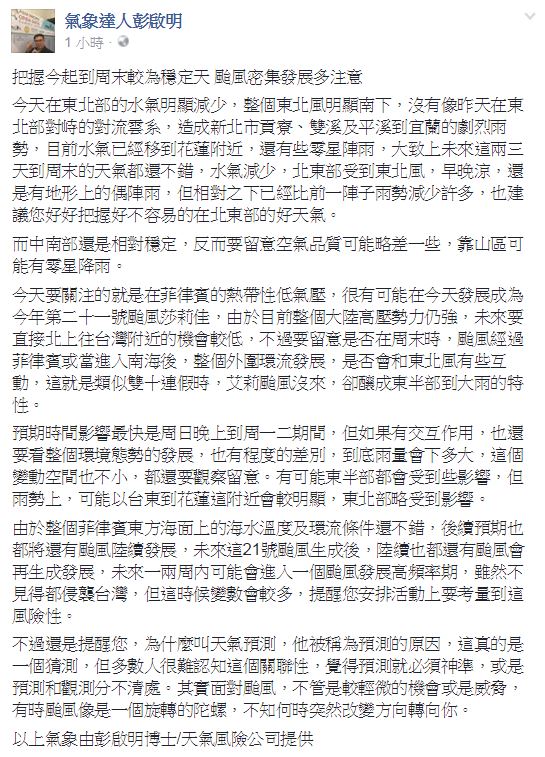 ▼彭啟明臉書發文(圖/氣象達人彭啟明)