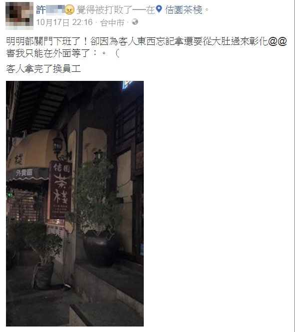 彰化一間茶棧的許姓店員前天(17日)晚上下班後,在自己的臉書PO文寫道:「明明都關門下班了!卻因為客人東西忘記拿,還要從大肚過來彰化,害我只能在外面等了」,並將貼文的地標標在工作的茶棧。一開始,許姓店員的朋友們留言送上關心「辛苦了」、「自己小心安全」,沒想到過沒多久,貼文中那位「東西忘記拿」的毛姓客人居然跑來留言批評「小姐你會不會太誇張啊,我們也不是故意要忘記拿東西的啊,我們也已經用最快的速度趕到。」最後還酸了一句「這樣也要PO文」。