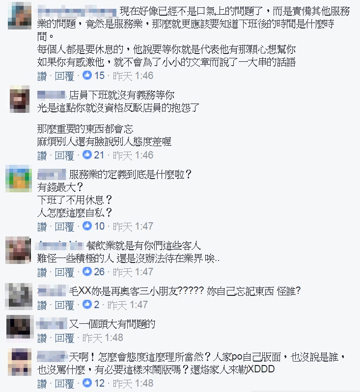 現在服務業下班後也有義務要服務?連私人臉書的小抱怨也被檢視!有一名許姓店員就因為下班打卡後,被迫在店裡面等客人來拿忘記帶的東西,只不過在臉書發文,小小抒發一下上班的心情,結果卻引來該名客人以及親友團的反擊!