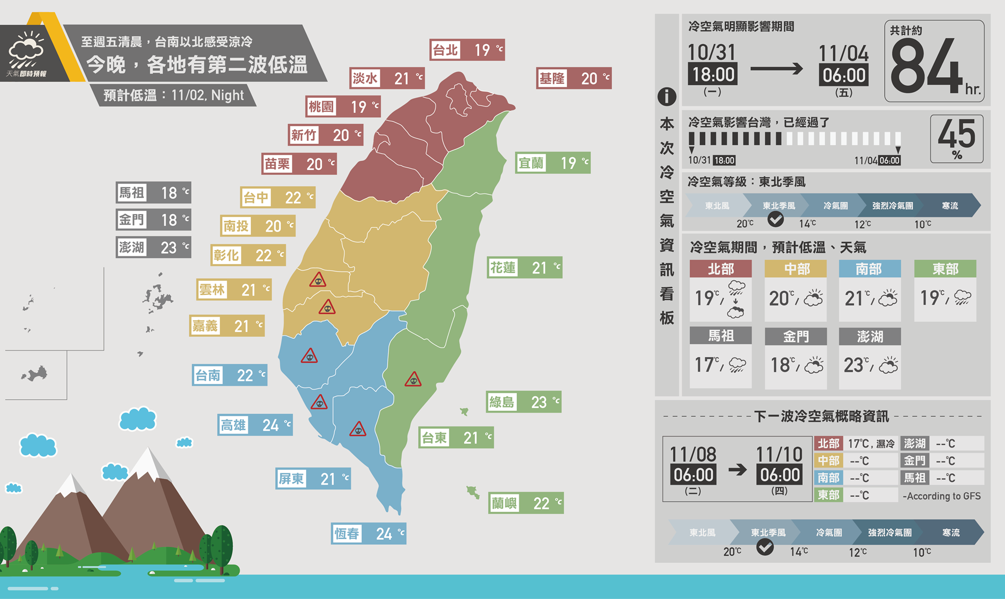 根據氣象達人彭啟明在粉絲團上的發文,他表示這次冷空氣勢力比想像中還要來得強,今天清晨宜蘭已經降到18度,淡水18.9度,新竹、台北也降至19度,連位在南部的台南都只有19到20度左右,高雄和昨天(1日)相比也降了2度到23度,全台都屬有點涼而感受上有點冷的天氣型態。