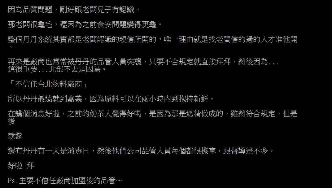這名網友還強調說「不去北部是因為『不信任台北的物料廠商』,所以丹丹最遠就到嘉義,因為原料可以在兩小時內保持新鮮」、「主要不信任廠商加盟後的品管」,最後更踢爆「之前的奶茶人覺得好喝,是因為那是奶精做成的,雖然符合規定,但事後…就醬」。