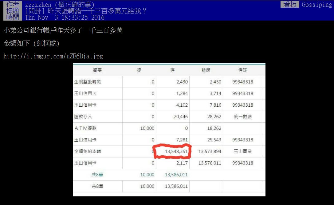 是誰這麼粗心大意!有位網友3日傍晚在PTT板上貼文求助,貼出自己帳戶的轉帳資料,指出他的公司銀行帳戶突然多了1300萬元新台幣,因此懷疑是有人不小心轉錯帳。網友呼籲當事人如果看到貼文,向他出示匯款證明,他將會完整歸還金額。