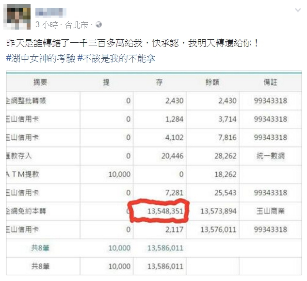 該名誠實的網友也在自己的臉書PO出照片,寫上「昨天是誰轉錯了一千三百多萬給我,快承認,我明天轉還給你!」,還說這個意外根本就是「湖中女神的考驗」,並表示「不該是我的不能拿」。