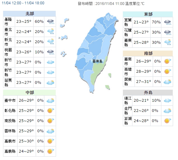 中央氣象局提醒,由於中南部日夜溫差大,早出晚歸的朋友,可多加件衣物以免受涼。降雨方面,東半部及大台北地區仍有局部短暫雨,桃園以南大多為多雲到晴的天氣,僅南部山區有零星短暫雨。