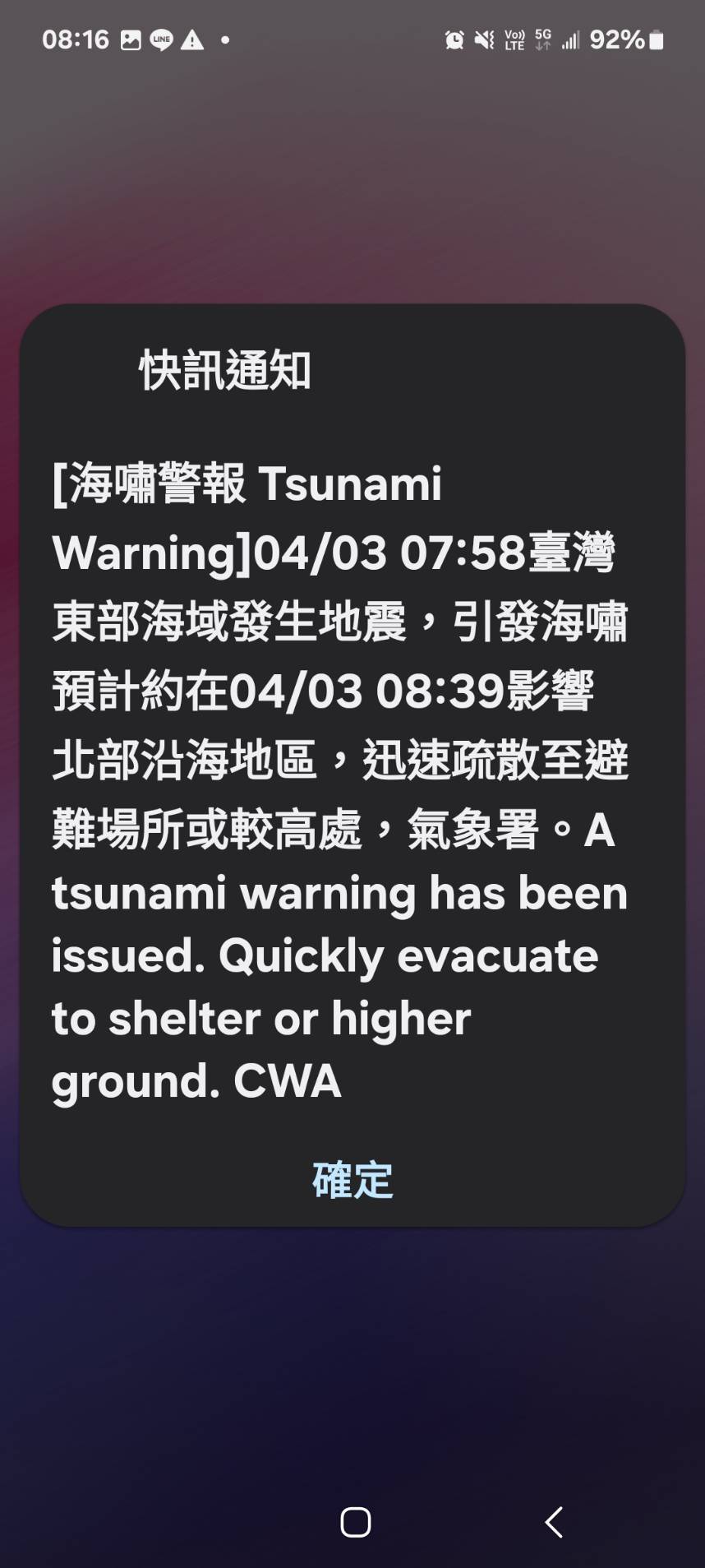簡訊中寫道,07:58台灣東部海域發生地震,引發海嘯,預計約在今日08:39影響北部沿海地區,氣象署也呼籲民眾迅速疏散至避難場所或較高處。