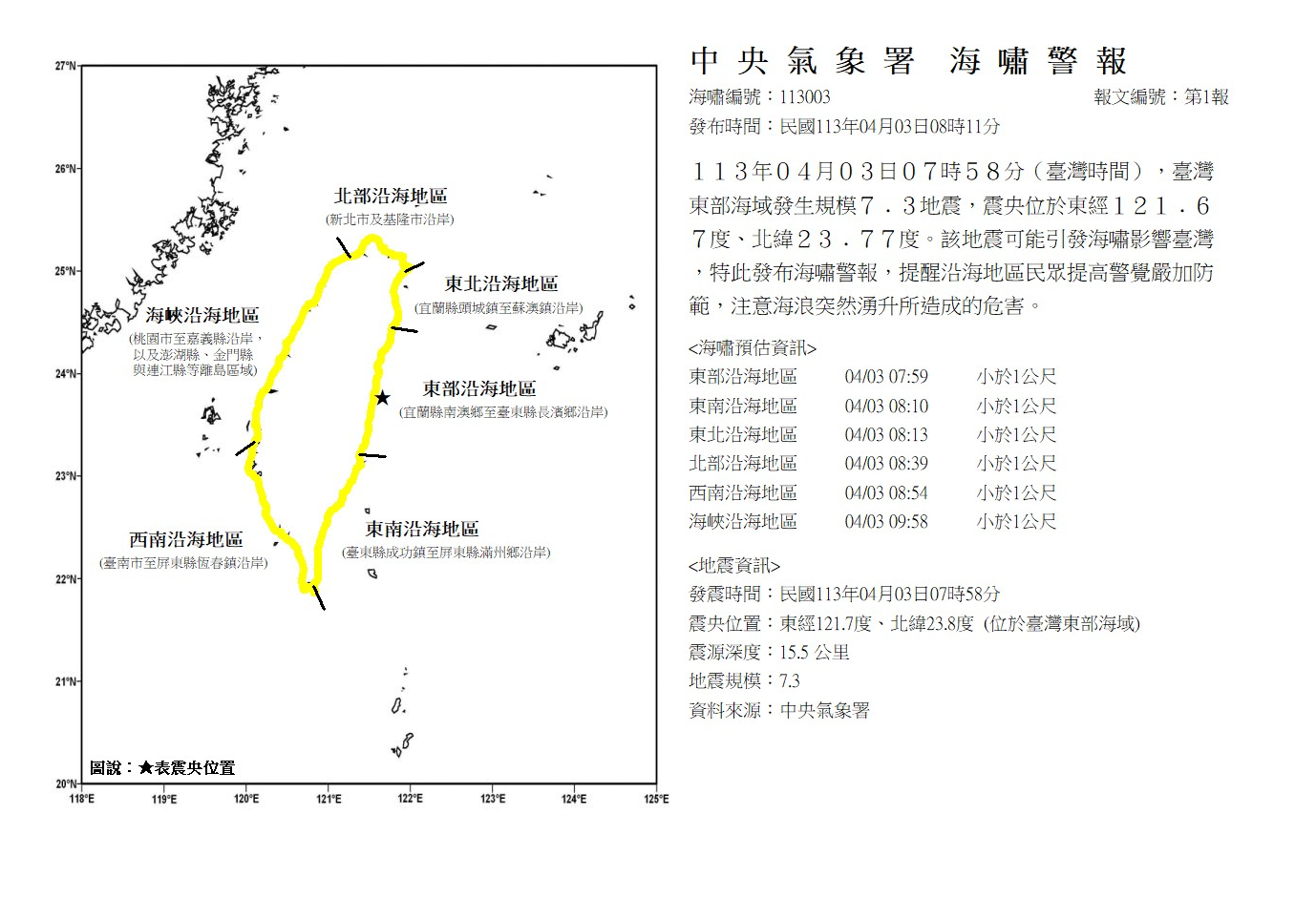 ▼中央氣象署發布海嘯警報。(圖/中央氣象署提供)