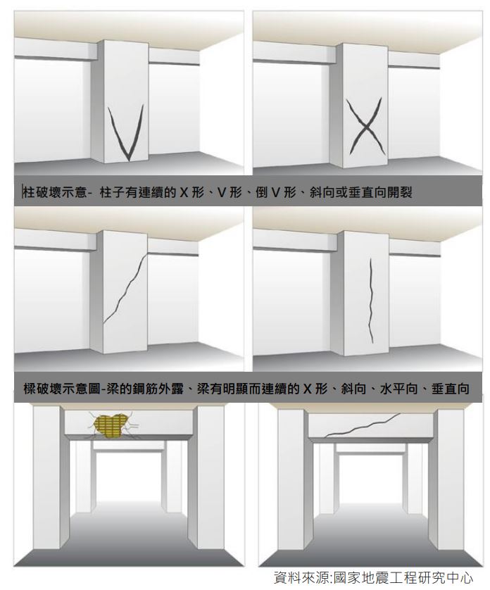 彰化縣建設處表示地震產生之振動,可能對混凝土構件產生龜裂、剝落或鋼筋握裏力不足等潛在質變,如果經過地震後,產生牆面龜裂,可以透過以下幾點初步判斷房屋結構是否損壞: