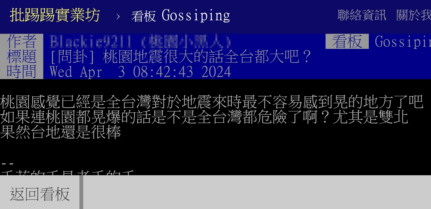 ▼有網友詢問地震時,桃園是不是晃動程度最小。(圖/翻攝自PTT)