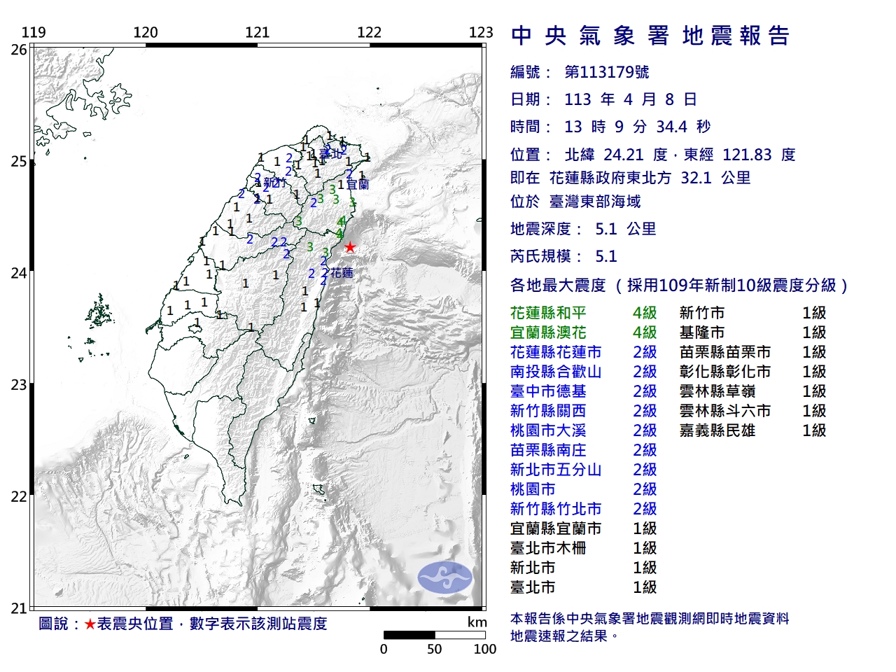 中央氣象署表示,13時09分發生有感地震,震央位於北緯24.21度,東經121.83度,即在花蓮縣政府東北方32.1公里 ,位於台灣東部海域,地震深度5.1公里,芮氏規模5.1。