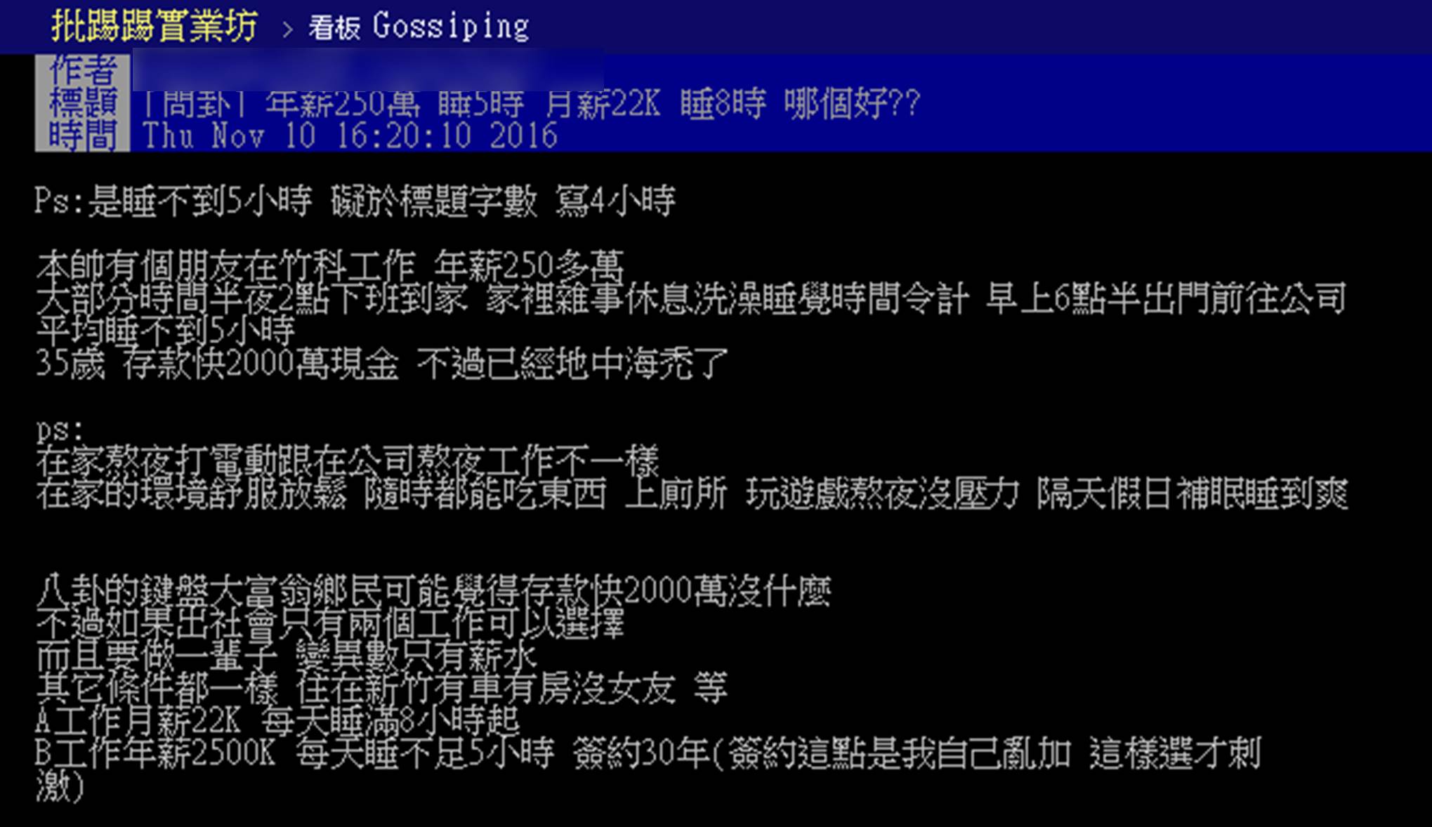 此PO文在網路引發正反兩面聲音,大部分網友都選「年薪250萬睡不到5小時」,有人說因為年薪250多萬好好存很快就能退休,「22K存一輩子也沒2千萬」、「有車有房了當然選250萬」,也有人說會硬撐個幾年,存夠之後就辭職,還有人開玩笑說「我選擇睡滿8小時年薪150萬」,甚至也有人批評「實在看不出來睡8小時是優點在哪裡?」,