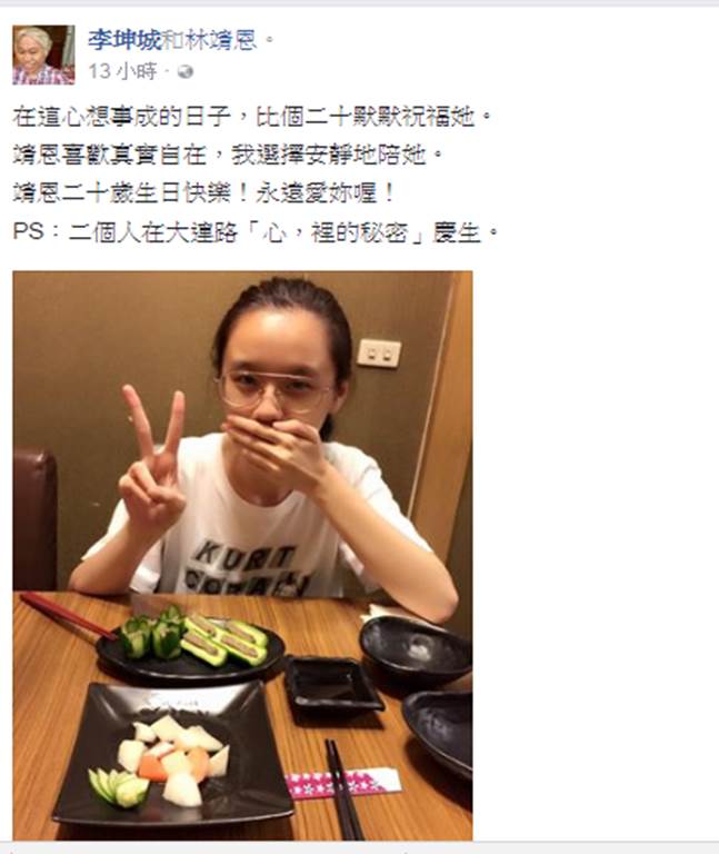 60歲李坤城與小41的女友林靖恩的「爺孫戀」,原本預計在女方滿20歲的時候就要完成結婚登記,沒想到卻臨時喊卡,只因為女方不想要結婚紀念日跟生日同一天,而小倆口目前仍持續在籌備婚禮。近來,林靖恩的父親接受周刊訪問時表示,自己曾感到自責,也猶豫過是否該給予祝福,並透露根本沒有要當「岳父」的喜悅,還不禁難過地說,每到深夜他都會守在家門外,為的就是希望能等到愛女回家,盼她能及早回頭,並痛批李坤城,奪走了他們一家平凡的幸福。