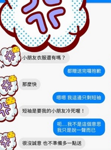 莊女被婦人怒嗆後,決定將對話PO上爆料公社要網友評評理,對話內容一開始婦人相當正常,詢問「小朋友衣服還有嗎?」,莊女表示「都贈送完囉,抱歉」,婦人也驚訝的回覆「那麼快」,莊女又說「這邊只剩短袖」,沒想到卻引爆婦人的怒火,怒嗆「短袖是要我的小朋友冷死喔!」,莊女當場傻眼,趕緊解釋「我不是這個意思,我只是說一聲而已」,婦人竟酸說「很沒誠意,也不準備多一點送」。