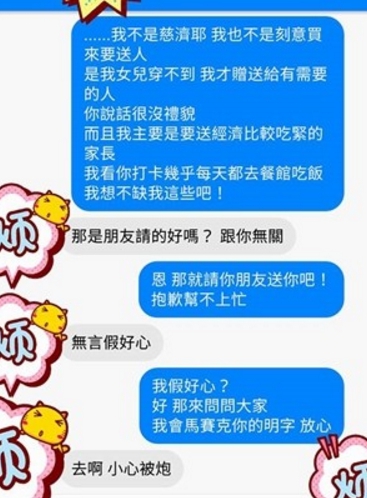 莊女這下也被這名婦人莫名其妙的情緒激怒,說「我不是慈濟耶,我也不是刻意買來要送人,是我女兒穿不到,我才送給有需要的人,你說話很沒禮貌,而且我主要是送給經濟比較吃緊的家長,我看你打卡幾乎每天都去餐館吃飯,我想不缺我這個吧!」,婦人再反駁「那是朋友請的好嗎?跟你無關」,還嗆莊女捐衣服是「假好心」,莊女實在受不了決定PO文請大家評斷,婦人還惡狠狠的說「去呀,小心被砲」。