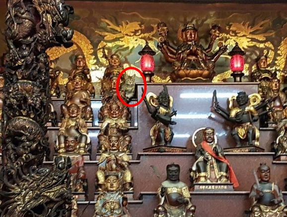 ▼貓咪躲在神明後面。(圖/截自爆料公社)