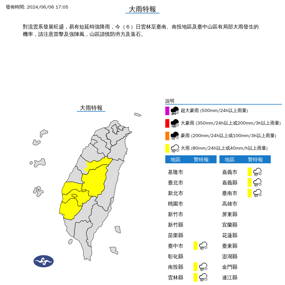 氣象署6日對「台中市、南投縣、雲林縣、嘉義市、嘉義縣、台南市」等6縣市發布大雨特報,並說明雲林至台南、南投地區及台中山區,有局部大雨發生的機率,請注意雷擊及強陣風,山區請慎防坍方及落石。