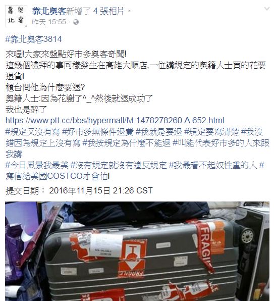 除此之外,網友還貼出一張張的退貨照,裡面可以看到各式各樣的商品,不僅有已經用舊還貼滿貼紙的行李箱、整箱20顆吃到剩3顆的奇異果,還有人異想天開,要拿購買超過一年的商品退貨,不料因為已經過30天退貨期限而遭值班經理拒絕,這名奧客居然還硬要辯解「規定又沒有寫」。