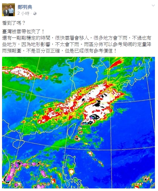 中央氣象局指出,受到南方水氣增加,鋒面接近的影響,下半天開始中部以北降雨機率增,入夜後天氣逐漸變得不穩定,全台更容易出現降雨情形。預報中心主任鄭明典也在臉書PO文表示,看到了嗎?臺灣被雲帶包夾了!還有一點點穩定的時間,很快雲層會移入,很多地方會下雨,不過也有些地方,因為地形影響,不太會下雨。雨區分佈可以參考局網的定量降雨預報圖,不是百分百正確,但是已經很有參考價值!