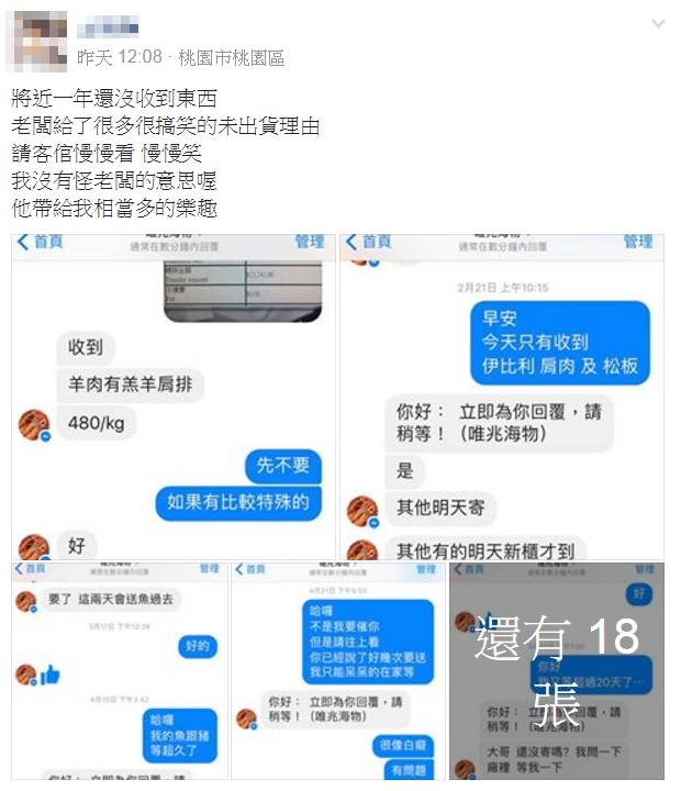 一名網友在臉書《爆笑公社》分享了他的網購心得,他說自己向網路賣家購買海鮮還有肉品,總共花了一萬多元,不過卻只有收到一半的貨,而且從今年二月催討到現在都快滿一年了,網友不但沒收到他定的東西,老闆還路陸續續用各種藉口解釋原因,讓網友無奈將對話記錄PO上網。