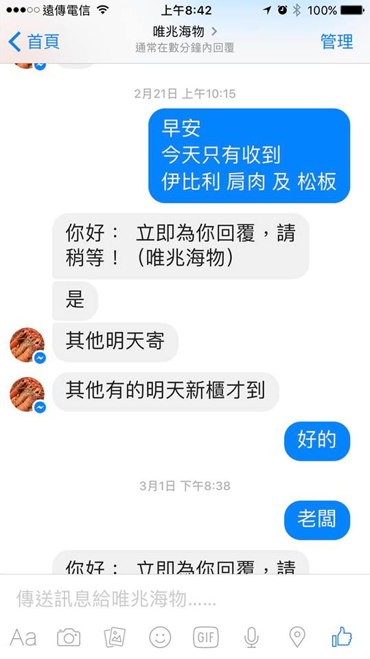 根據訊息記錄顯示,這段期間網友在二月中就訂購了生鮮肉品,當時賣家漏寄了魚和豬肉,網友好幾次私訊告知,老闆都是以「明天寄,明天新櫃才到」、「這兩天送魚過去」、「禮拜一幫你寄」等理由來回覆網友。