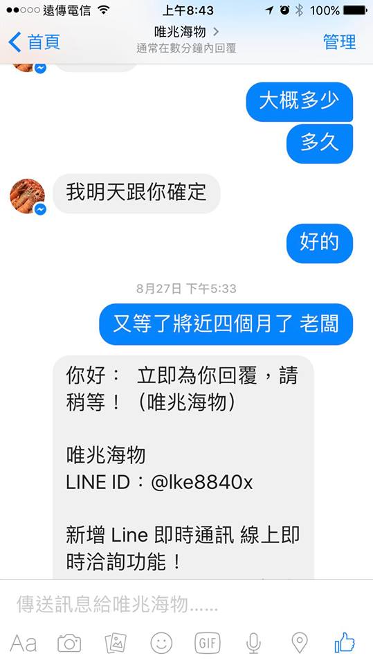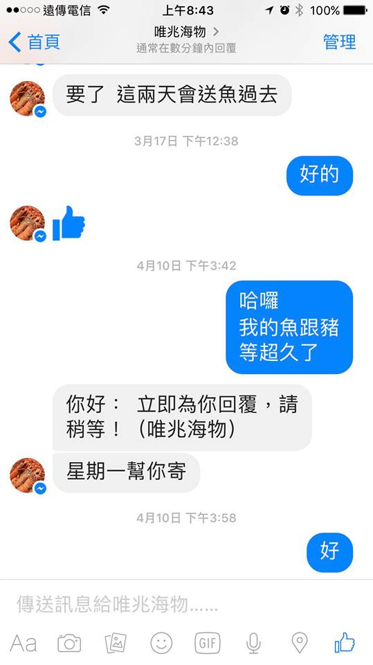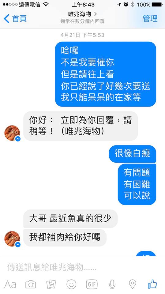 但是等到四月,網友終於等得不耐煩,傳訊息問跟賣家表示「不是我要催你,但是請往上看,你已經說了好幾次要送,我只能呆呆的在家等」,還直呼自己這樣「很像白癡」,希望賣家若有困難可以說出來,老闆則回應「最近魚真的很少,我都補肉給你好嗎」。