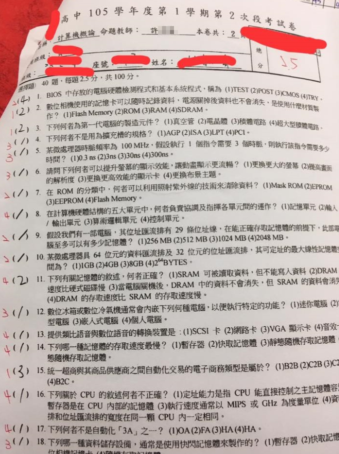 該位老師在臉書上PO出一張期中考