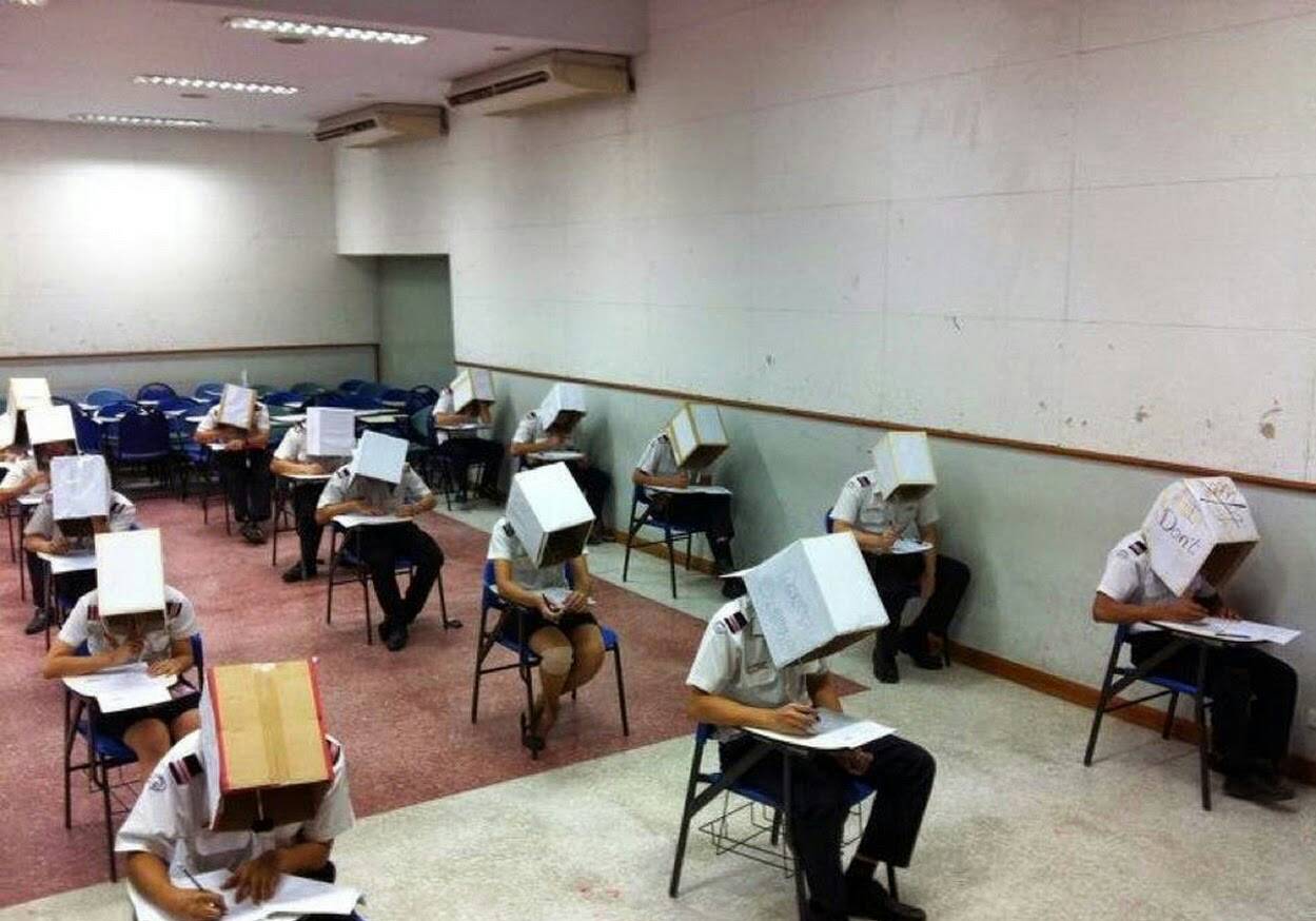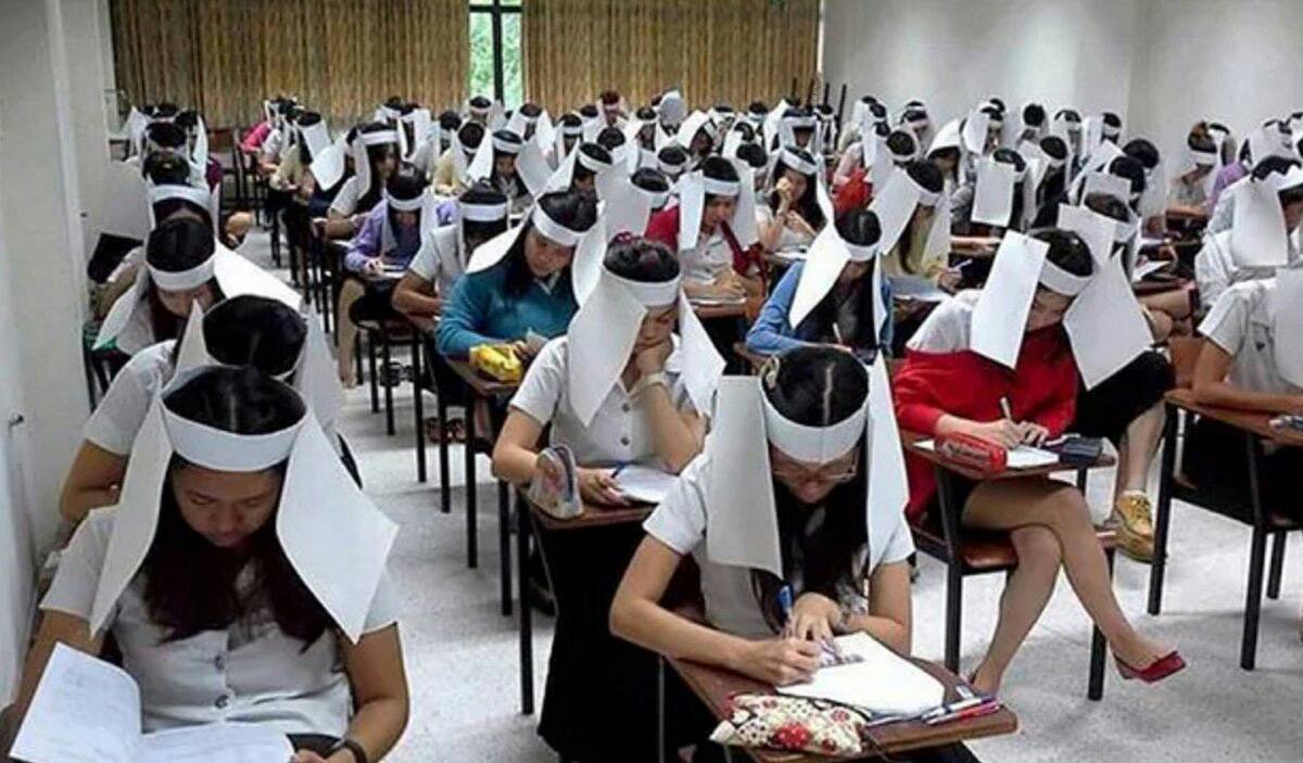 作弊,採取極度誇張手段,第一張圖片是發生在泰國Kasetsart大學,學生考試的時候,必須戴上特殊「防弊紙帽」,從照片中可以看到,一戴上此帽子,就算轉頭左顧右盼也「什麼也看不到」。第二張圖同樣發生在泰國,不過這次不是學生考試,而是民航中心的測驗,只見每位考生必須頭戴特製箱子,只能看見自己眼前的東西,別想用餘光瞥到隔壁考生的答案!