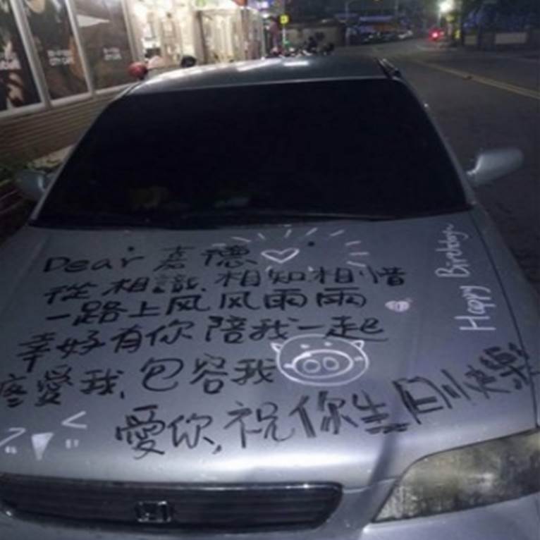女友另類的「用心」,卻讓男友超感動!台南一名女子,為了讓男友在慶生當天有大驚喜,竟然出奇招,在男友的愛車上,用筆寫下滿滿的祝福與感謝的話,高調炫愛,網友不禁替她擔心「男友會暴怒吧?」