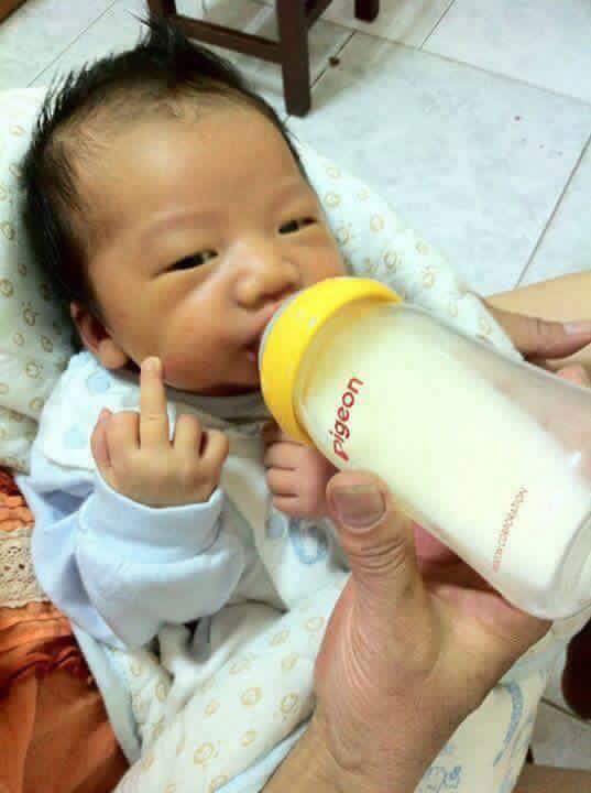 有網友在臉書《爆笑公社》分享了一張照片,只見照片中的寶寶窩在長輩的懷裡,嘴裡吸著奶瓶喝「ㄋㄟㄋㄟ」,但是他的眼神卻直狠狠地盯著鏡頭,右手更是忍不住使壞,竟然清輕楚楚地比了中指!這樣霸氣的畫面被捕捉之後,讓網友看傻眼,發文「誰教你的…」。