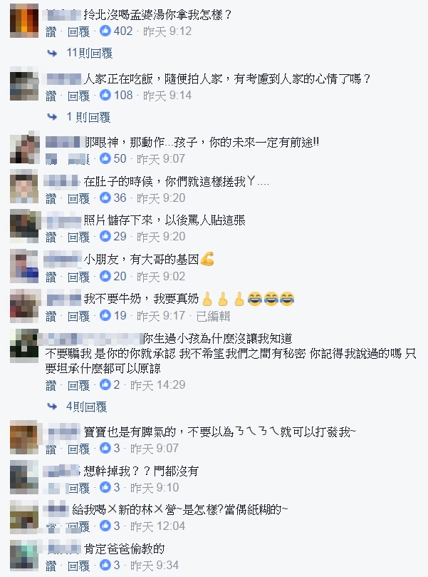 照片分享到網路上後,網友們紛紛幫小寶寶配音,開玩笑地留言,「拎北沒喝孟婆湯你拿我怎樣?」、「人家正在吃飯,隨便拍人家,有考慮到人家的心情了嗎?」、「在肚子的時候,你們就這樣搓我啊」、「寶寶也是有脾氣的,不要以為ㄋㄟㄋㄟ就可以打發我」、「94要霸氣的喝奶」。就連爆料公社小編也留言「嗯!動作很確實」。