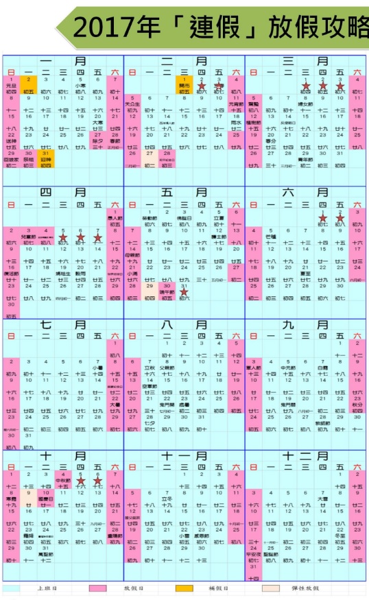 年假還沒休完?根據行政院人事行政總處公布的2017年政府行政機關辦公行事曆,明年的連續假期比今年(2016)多了一個,總計有8個連假、116日放假天。不過有眼尖網友發現,在這些連假間技巧性的「請假」,其實可以延長假期,最長達10天之久。