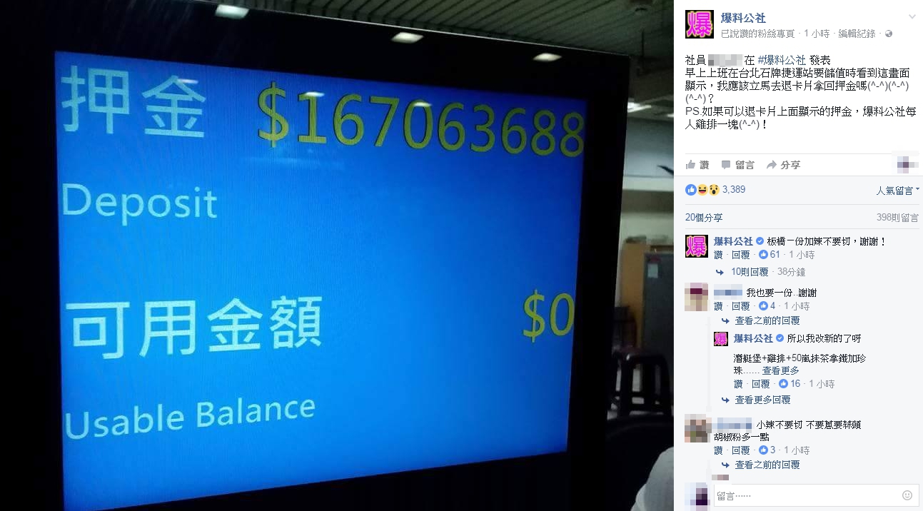 1日晚間,一名網友在臉書《爆料公社》PO文表示,早上要去上班時,在石牌捷運站儲值悠遊卡,結果加值機器的螢幕出現了一串數字「167063688」,竟然是高達1.6億元的押金!於是他馬上拍下照片PO上網路,直呼「我應該立馬去退卡片拿回押金嗎?」,甚至還放話「如果可以退卡片上面顯示的押金,爆料公社每人雞排一塊」!