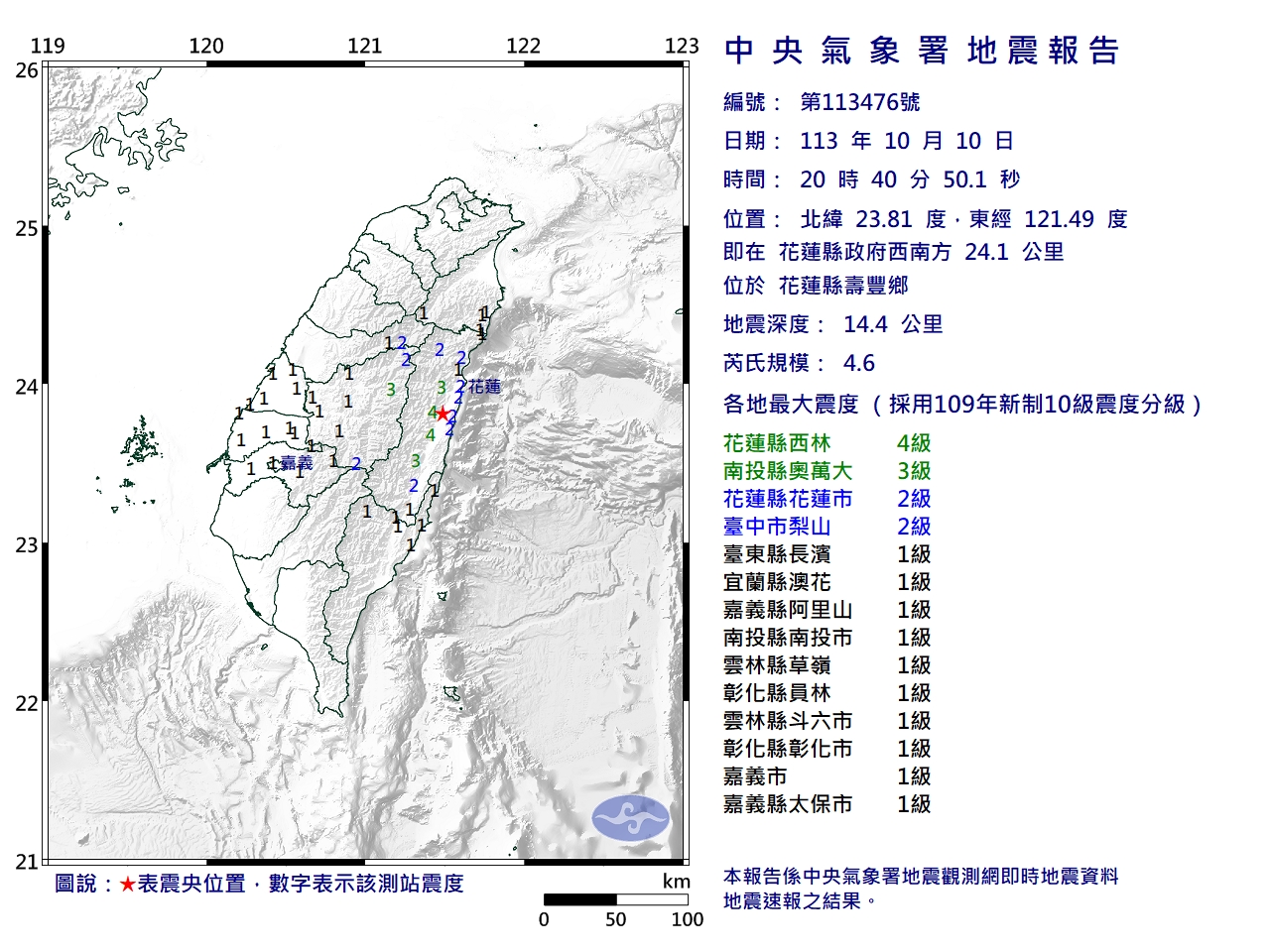 中央氣象署表示,20時40分發生有感地震,震央位於花蓮縣壽豐鄉,即在花蓮縣政府西南方24.1公里,地震深度14.4公里,芮氏規模4.6。