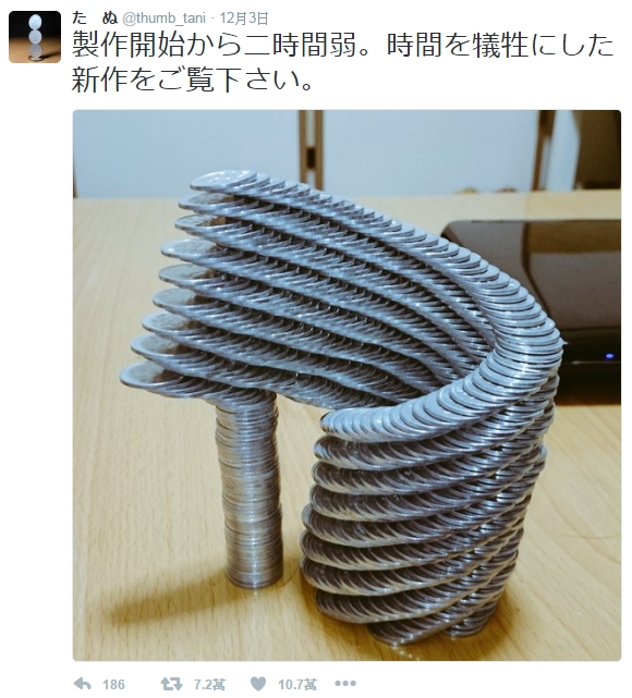 這次他發表了硬幣螺旋塔的新作品,又再度引起網友瘋狂,「た ぬ」在兩個小時內就輕易完成了這個結構複雜,極度需要耐心與技巧的硬幣螺旋塔,推文才po出4天便獲得了10.7萬個愛心、7.2萬次的轉貼,還獲得了「謎之術」的封號。