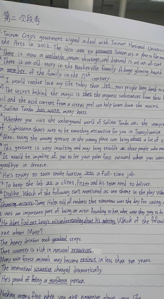 高中英文老師Steven在「爆廢公社」上表示,有位高一生段考英文考了59.5分,而這個分數在系統和成績單上不會自動四捨五入,於是該名同學非常主動地將自己答錯的題目和答案,在作業本上全部抄一遍,總共寫了滿滿2頁,然後將作業本放到老師桌上,並且留下一張紙條,希望可以