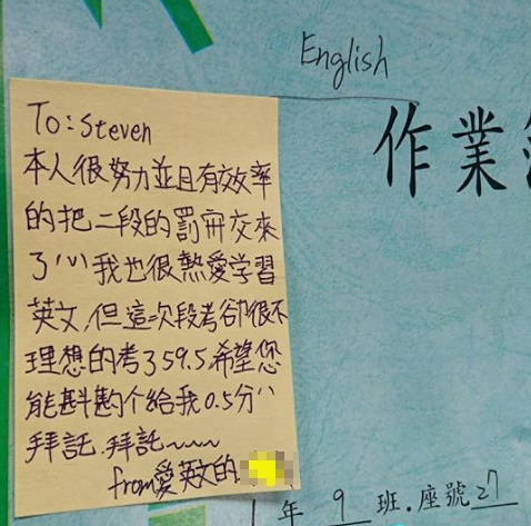 學生在紙條上表示,自己非常熱愛英文和學習,但是這次