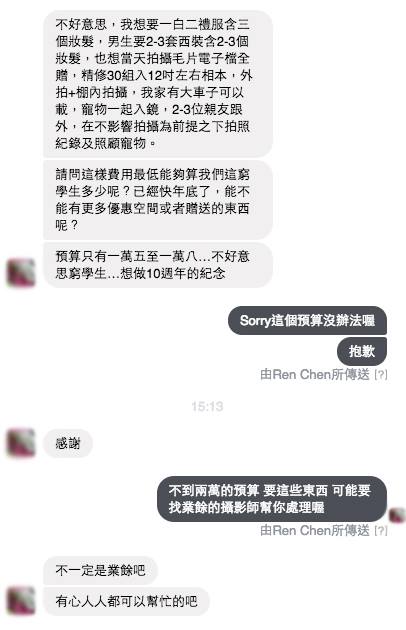 這名婚攝在臉書PO文出新人的瘋狂要求後,被網友轉至臉書《爆料公社》,立刻引起熱烈討論。從對話截圖可以看到,新人向婚攝提出拍攝要求,「我要想一白二禮服三個妝髮,男生要2-3套西裝含2-3個妝髮,也想當天拍攝毛片電子檔全贈,精修30組入12吋左右相本,外拍+棚內拍攝,寵物一起入鏡」,還說明自己家中有大車可載,2~3位親友會在不影響拍照下跟拍並照顧寵物,最後詢問價格還強調自己是窮學生,而且已經快年底了,是否能有更多優惠或贈送東西,直說「預算只有1萬5至1萬8,想做10周年的紀念」。
