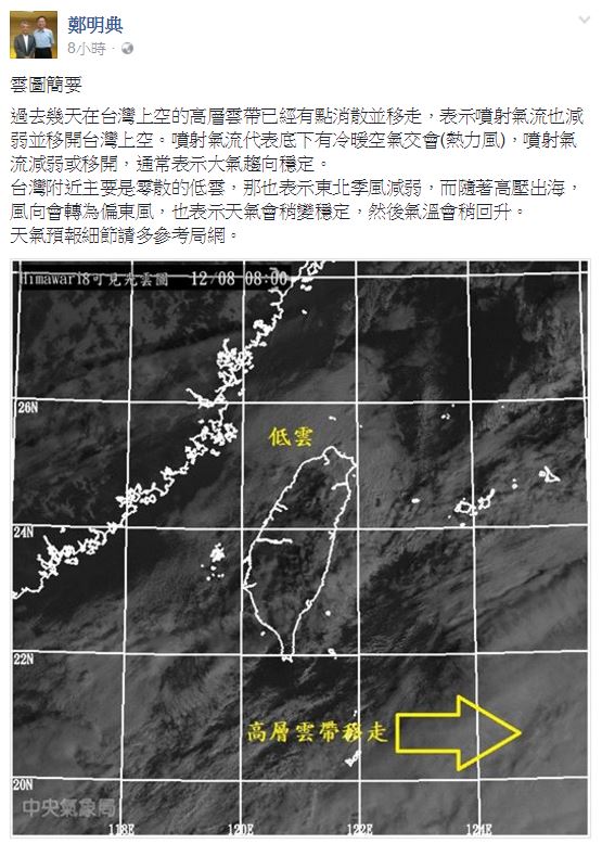 氣象局預報中心主任鄭明典今早在臉書上貼文說,過去幾天在台灣上空的高層雲帶已經有點消散並移走,表示噴射氣流也減弱並移開台灣上空,通常表示大氣趨向穩定。台灣附近主要是零散的低雲,東北季風減弱,天氣稍變穩定,比起前幾天,氣溫會稍微回升。但北部感受並不明顯,高溫約21至23度,中南部25至27度。