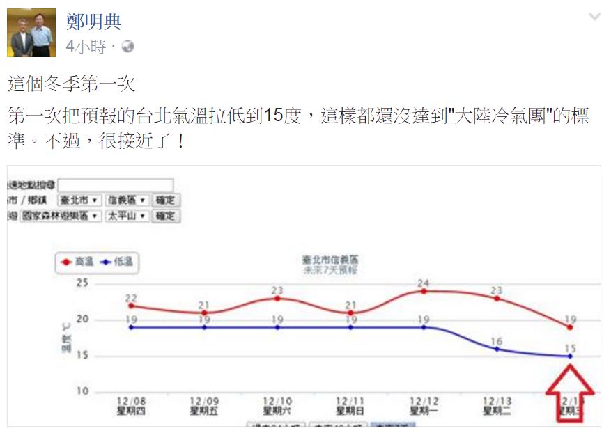 ▼鄭明典貼文表示下週三台北恐下探15度。(圖/鄭明典)