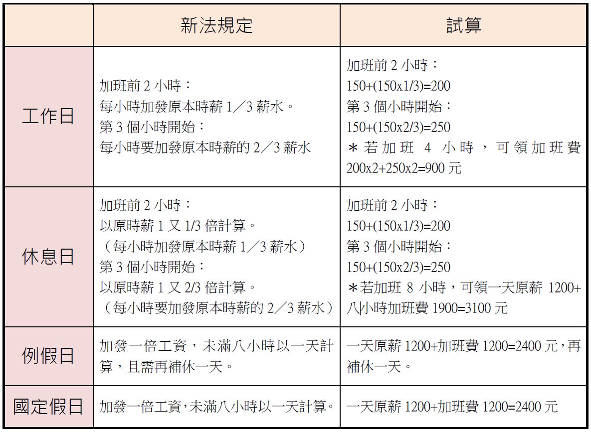 根據《勞基法》新規定,「平常日」加班,前2小時,每小時增加原本時薪的1/3薪水,2小時之後,每小時要加發原本時薪的2/3薪水。而在「休息日」加班,除了要給原本一天的薪資之外,明年起新增規定,前2小時再加發1/3,2小時之後也要加發2/3,而且休息日加班不滿4小時也要以4小時工資計算。