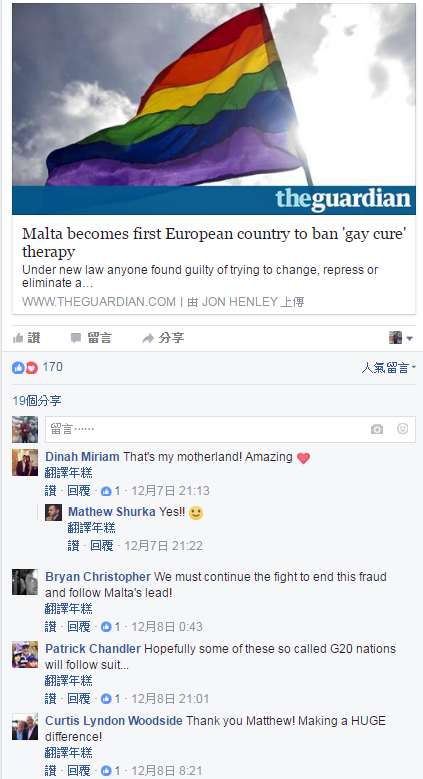 ▼修卡平常十分關注廢除性傾向治療議題,圖為他在臉書分享報導和網友回應(圖/翻攝Mathew Shurka臉書)