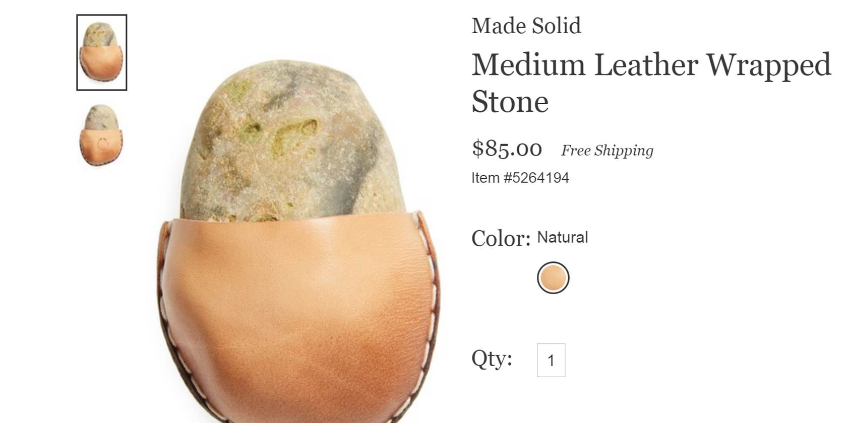 皮革包裝石共有2種大小,分別要價65美元及85美元,據《CBS新聞》報導,Nordstrom一位發言人證實,目前85美元的「皮革包裝石」在網路商店和大部分實體店面已售罄。事實上,只剩芝加哥一間商店剩下2顆65美元大小的「皮包石」。