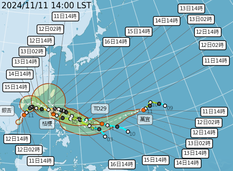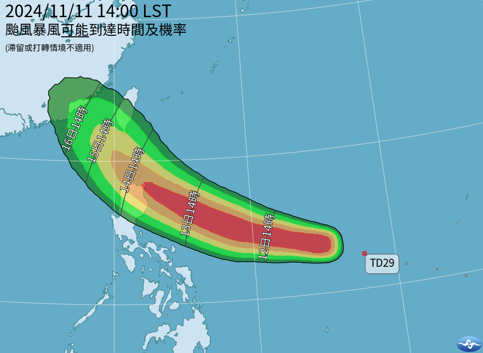 氣象署說明,位於關島西南方海面的熱帶性低氣壓,未來有發展為輕度颱風的趨勢,向西北西方向移動,預計本週後期接近台灣,後續路徑及動向不確定性仍偏大,根據《ETtoday新聞雲》的報導,氣象署預報員陳姵安指出,熱帶低氣壓TD29預計今晚將升格為輕颱,並持續向西北方向移動。若發展順利,最強可達中颱等級。