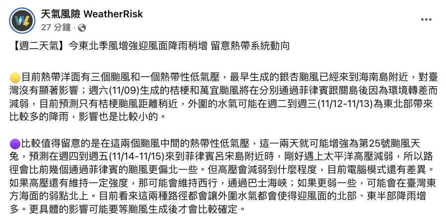 粉專提醒,如果屆時高壓還有維持一定強度,那可能會維持西行,通過巴士海峽;如果更弱一些,可能會在臺灣東方海面的弱點北上。目前看來這兩種路徑都會讓外圍水氣都會使得迎風面的北部、東半部降雨增多。更具體的影響可能要等颱風生成後才會比較確定。